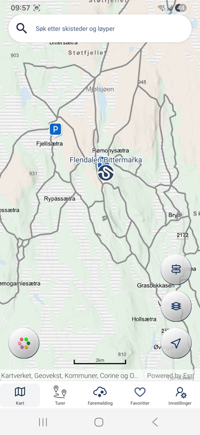 Skitrasène i Flendalen/Bittermarka er nå synlige i appen (se bilde).
